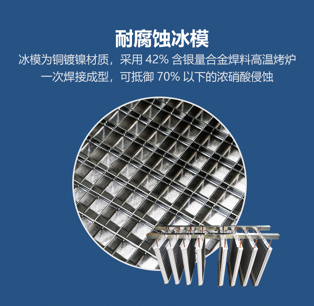 2、冰模采用鍍鎳銅材質(zhì),可抵御70%以下的濃硝酸侵蝕。