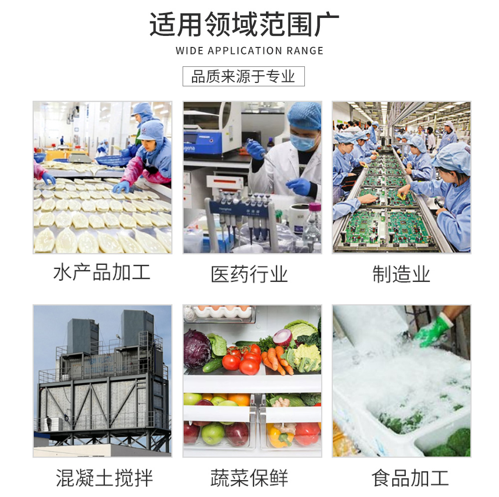 片冰遍布于: 食品水產(chǎn)品加工、制造業(yè)、混凝土降溫、醫(yī)藥行業(yè)、禽類加工、漁業(yè)、禽肉類加工、蔬菜配送及保鮮、 化工染料等需要冰的地方。